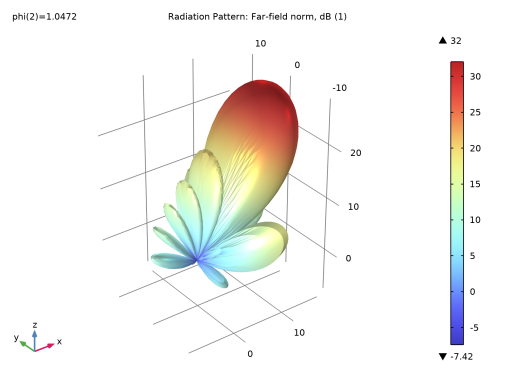In the Model Builder window, expand the Results > 3D Far Field, Gain (emw) node, then click Radiation Pattern 1.