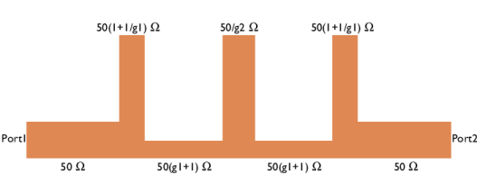 Scale the impedance of stubs by the reference characteristic impedance (50 Ω) and set the length of stubs to 0.125 wavelengths defined by the cutoff frequency.