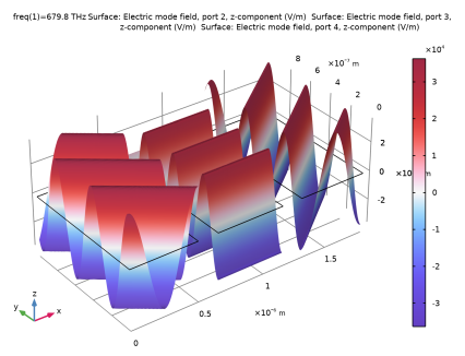 In the Settings window for Surface, click Replace Expression in the upper-right corner of the Expression section. From the menu, choose Component 1 (comp1) > Electromagnetic Waves, Frequency Domain > Ports > Electric mode fields > Electric mode field, port 2 - V/m > ewfd.Emodez_2 - Electric mode field, port 2, z-component. This represents the mode field of the zero-order port on the transmission side.