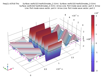 In the Settings window for Arrow Line, click Replace Expression in the upper-right corner of the Expression section. From the menu, choose Component 1 (comp1) > Electromagnetic Waves, Frequency Domain > Ports > Wave vectors > ewfd.kModex_3,ewfd.kModey_3 - Port mode wave vector, port 3.