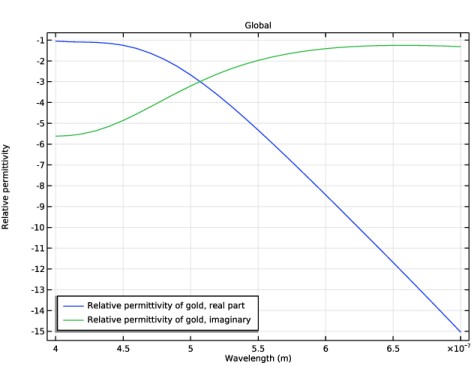 In the Settings window for Global, click Replace Expression in the upper-right corner of the y-Axis Data section. From the menu, choose Component 1 (comp1) > Definitions > Variables > epsilonr_gold - Relative permittivity of gold - 1.