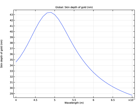 In the Settings window for Global, click Replace Expression in the upper-right corner of the y-Axis Data section. From the menu, choose Component 1 (comp1) > Definitions > Variables > deltaS_gold - Skin depth of gold - m.