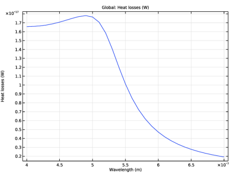 In the Settings window for Global, click Replace Expression in the upper-right corner of the y-Axis Data section. From the menu, choose Component 1 (comp1) > Definitions > Variables > l_gold - Heat losses - W.