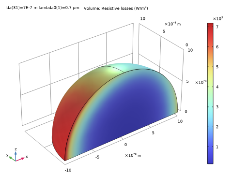 In the Settings window for Volume, click Replace Expression in the upper-right corner of the Expression section. From the menu, choose Component 1 (comp1) > Electromagnetic Waves, Frequency Domain > Heating and losses > ewfd.Qrh - Resistive losses - W/m³.