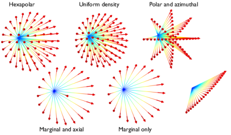 Hexapolar: specify the Number of polar angles Nθ (dimensionless). In this distribution, for each release point, one ray will be released along the cone axis. Six rays are released at an angle α/Nθ from the cone axis, then 12 rays at an angle of 2 α/Nθ, and so on. The total number of directions is Nw = 3 Nθ( Nθ + 1) + 1.