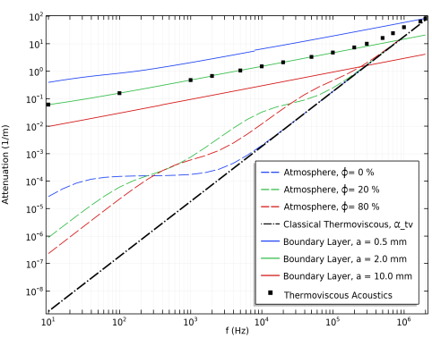The thermoviscous boundary layer attenuation for different duct radii (a = 0.5 mm, 2.0 mm, and 10.0 mm) modeled using the Narrow Region Acoustic feature.