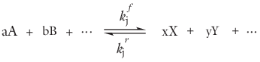 Here, and denote the forward and reverse rate constants, respectively. The concentration of species i is denoted as ci (SI unit: mol/m3). The stoichiometric coefficients are denoted νij, and are defined as being negative for reactants and positive for products. In practice, a reaction seldom involves more than two species colliding in a reacting step, which means that a kinetic expression is usually of order 2 or less (with respect to the involved concentrations).