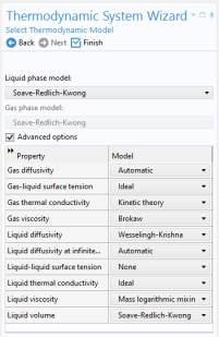 Select the Advanced options checkbox in order to manually control the models used for thermodynamic properties, transport properties, and surface tension. When this checkbox is selected, all available property models are shown in the property model table. The available property models are dependent on the phases available in the thermodynamic system.