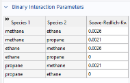 This section can be used to inspect and edit binary interaction parameters. Select a pair of species (first and second column, Species 1 and Species 2) as shown in Figure 6-7 to edit the corresponding binary interaction parameter currently in use. In cases that the thermodynamic model has more than one type of binary interaction parameter, each type of the interaction parameter will be shown in a column in the table.