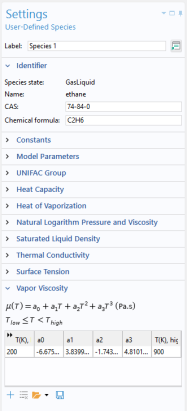 The data needed for a user-defined species includes both material properties, such as the molar mass and the vapor pressure, and properties for specific thermodynamic models or transport models (see Thermodynamic Models and Theory). For instance, in order to use the UNIFAC thermodynamic model, you need to define UNIFAC groups for the new species.