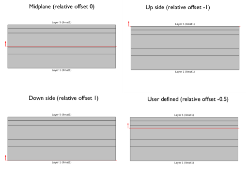 In that node, you select the boundaries where you want to attach the layer definition. The position of the geometric boundaries with respect to laminate definition is also defined. You can attach the boundary to the laminate midplane, downside, upside, or at a user-defined location as shown in