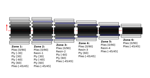 Based on the specified stacking sequence and the selection of each ply, the entire selection is divided into various zones which can be seen in the Stack Zone Definition section in the Layered Material Stack node.