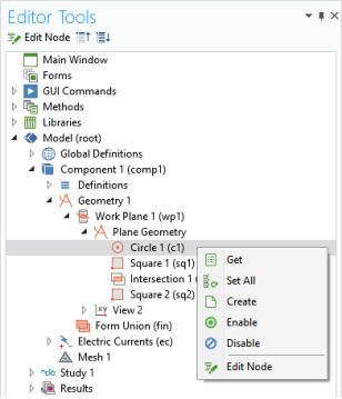 The Editor Tools window provides code for common model operations (for example, setting all nondefault properties of a feature) and options to create applicable form objects corresponding to a model operation.