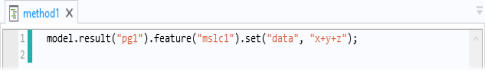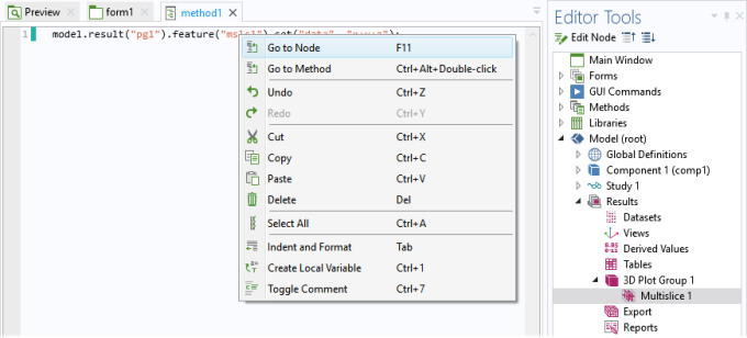 If you click the Go to Node button () in the Method ribbon toolbar, then the source code at the cursor is mapped to an entity in the embedded model. If possible, the corresponding entity is shown in the Editor Tools window. This window is opened automatically if it is not already open. You can also right-click the code and select Go to Node when you are positioned on a part of the code that refers to the embedded model.