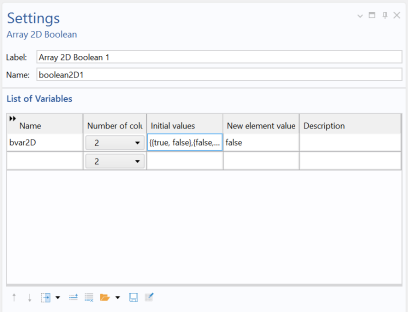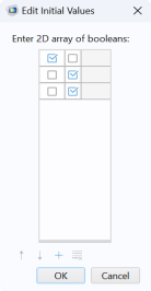 Initial values column in the window that opens. For example, the following image shows how you can edit the rows and columns of the boolean 2D array.