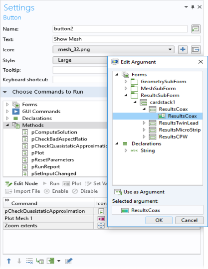 For some command sequence commands, you can use declarations in the arguments. Such declarations are possible to use for commands to plot graphics, view built-in commands, run numerical features, set declarations, and run methods. For the commands to plot graphics, view built-in commands, and run numerical features, you can use this functionality in the Edit Arguments dialog. You can also enter the arguments manually. To access a scalar, an array as an array, or a matrix as a matrix (as opposed to accessing individual array or matrix elements), use the name of the declaration itself (