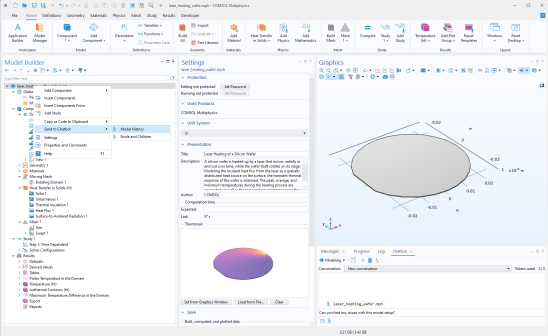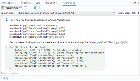 Chatbot window can help with both programming tasks using the COMSOL API for Java and general modeling tasks within the COMSOL Desktop. The
