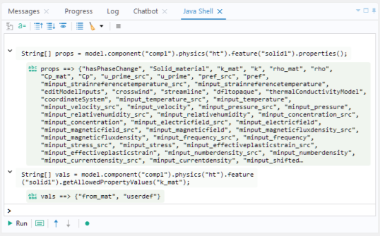 returns the allowed values for named properties, if it is a finite set. The figure below illustrates how to use the Java Shell window to retrieve these properties and values. This example assumes that a heat transfer model is open in the user interface.