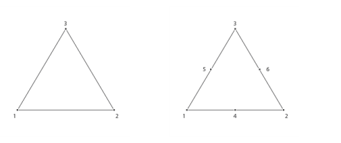 Triangular element (tri) as a first-order element (left) and a second-order element (right):