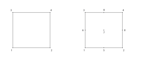 Quadrilateral element (quad) as a first-order element (left) and a second-order element (right):