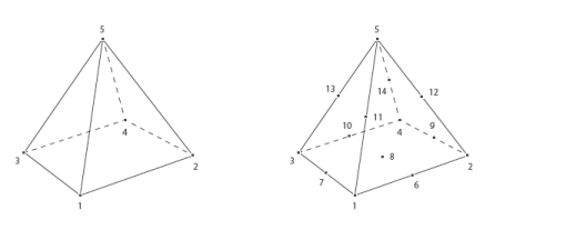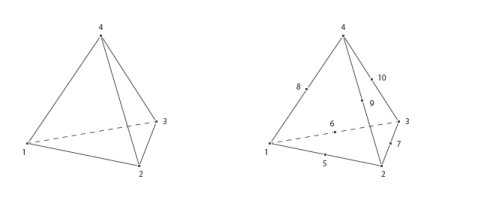 Tetrahedral element (tet) as a first-order element (left) and a second-order element (right):