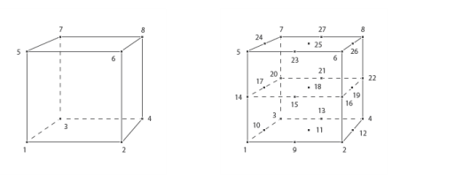 Hexahedral element (hex) as a first-order element (left) and a second-order element (right):