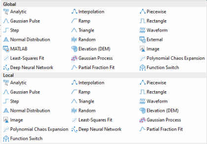 To add global functions, in the Home toolbar (Windows users) or main toolbar (macOS and Linux users) select an option from the Functions menu from the Global submenu, or right-click the Global Definitions (
