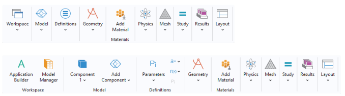 The COMSOL Desktop in the cross-platform version, primarily for the Linux® and macOS operating systems, looks slightly different than the one for the Windows® operating system (shown in Figure 2-1). The primary difference is that the main menu and main toolbar are used instead of ribbons. Otherwise, the default windows (Model Builder, Graphics, Settings, Log, Progress, and Messages) are in the same location on the default desktop layout. See The COMSOL Desktop Menus and Toolbars for more details.