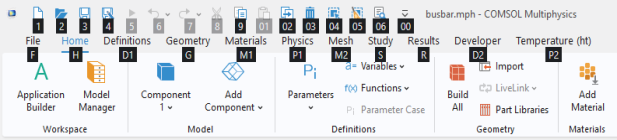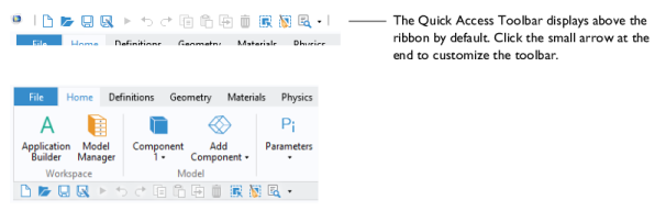 The top of the COMSOL Desktop includes a customizable Quick Access Toolbar. Underneath this are ribbon tabs and ribbon groups, which together, are referred to as toolbars. The