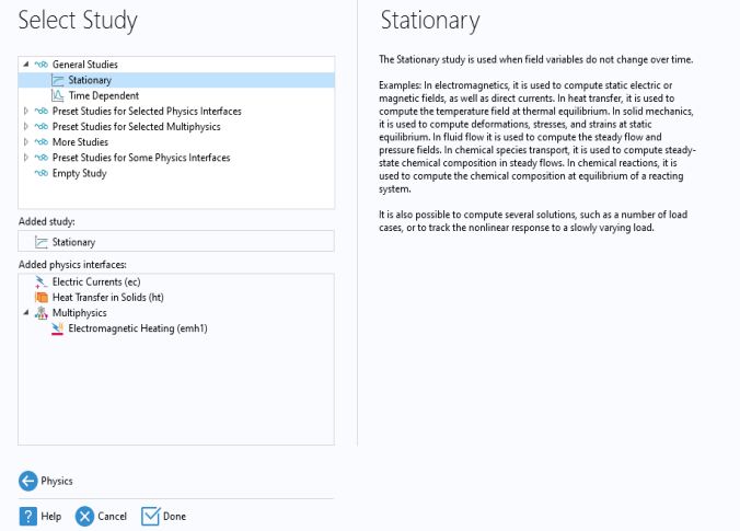 On the Select Study page, click to select the type of study to perform. You can also double-click the study to select it and close the Model Wizard. The available options depend on the set of physics interfaces included in the model. Some study types are applicable to all physics interfaces for which you choose to solve, while others are not, but all are in some way available. The most applicable and common studies, such as