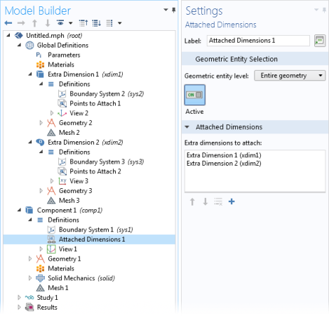 ) node forms the Cartesian product of its selection in the base geometry and the entire geometries of all selected extra dimensions. It is possible to add several Attached Dimensions features forming Cartesian products with different sets of extra dimensions. Each such Cartesian product is called a