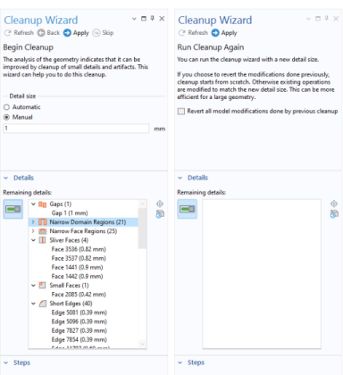 Figure 7-21, to manually step through each step in the cleanup process. It is possible to modify the detail size used by the process, to skip steps in the process, and to go back and forth between steps to see if the action made wanted changes to the geometry. It is also possible to mesh the geometry before and after a step in the process to check how the element quality is influenced.