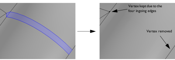 In the case of a face being collapsed into a vertex, it is typically collapsed into the vertex with the most ingoing edges. If that number is the same for all vertices, the face is collapsed to the vertex with the lowest index. With the default Automatic setting a sliver face is more likely to be collapsed into an edge, in which case the tolerance value is set to a value smaller than the face perimeter. For a face that is collapsed to a vertex the tolerance value is larger than the face perimeter.