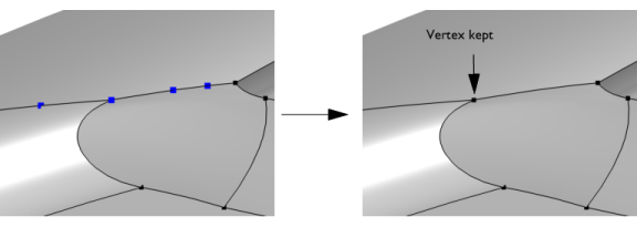 Remove Details operation provides a fully automated way to find and remove isolated vertices and vertices adjacent to two edges. The evaluation is based on an angle criterion to only remove vertices if the tangent is considered to be continuous.