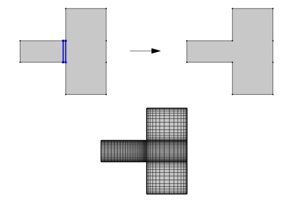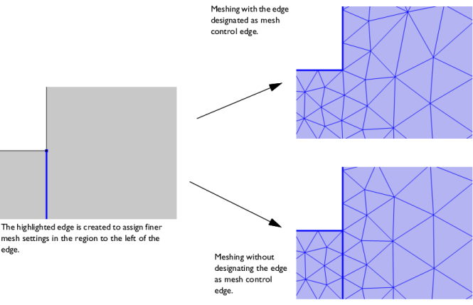The operation removes a selection of edges that are isolated or that are adjacent to precisely two faces (in 3D) or two domains (in 2D, as shown in Figure 7-128). The edges act as a partitioning, and are removed from the geometry, but become available when you build the mesh. Use a mesh control edge to control the element size inside a domain, or to create a mapped mesh in regions, as shown below. Mesh control edges do not change the number of domains (2D) and edges displayed in the physics settings.