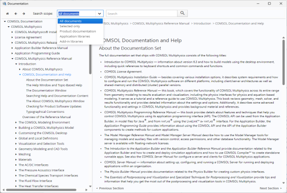 Based on your license, links to the HTML versions of the product documentation are accessed and can be browsed in the tree. When you click a topic in the tree the information displays to the right. You can also adjust the search scope.