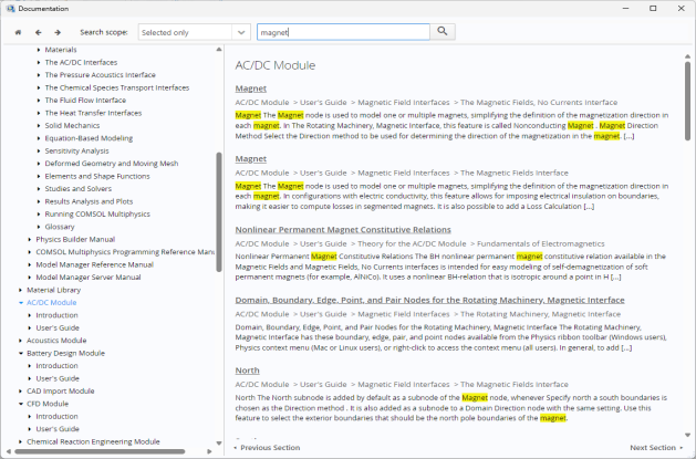 COMSOL Multiphysics Reference Manual) and then the search includes all the documents below the selected node until the beginning of the next branch. In this example it searches until the end of the Troubleshooting License Errors section.