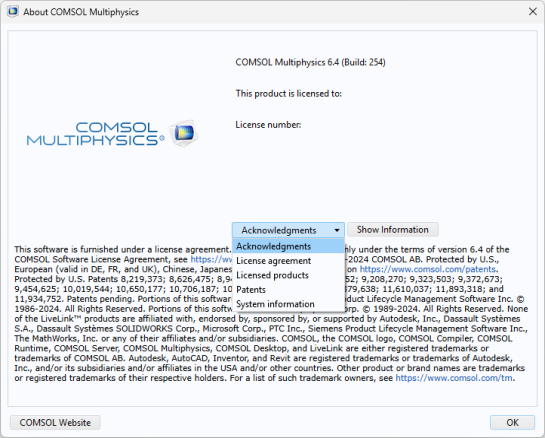 Select Patents to show the patents that the COMSOL software products are protected by.