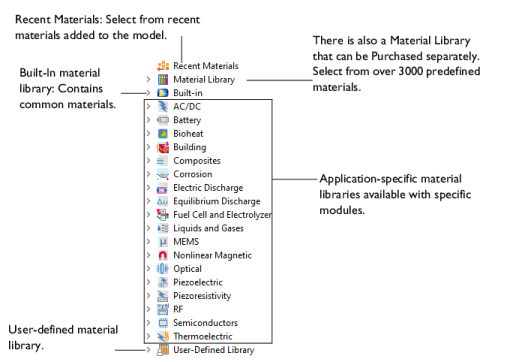 Built-in: Included with COMSOL Multiphysics, the Built-in library contains common materials with primarily electrical, structural, and thermal properties. The materials in this library can be considered as examples of common materials with typical values for their material properties. The Air and Water, liquid materials use the same temperature- and pressure-dependent property values as the corresponding values in the Liquids and Gases Material Library. Nimonic is a registered trademark of Huntington Alloys Corporation.