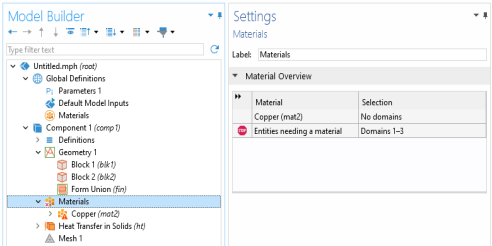 Selection column contains the geometric entities in which a material definition is missing. The Materials node also indicates when there is a material error (see