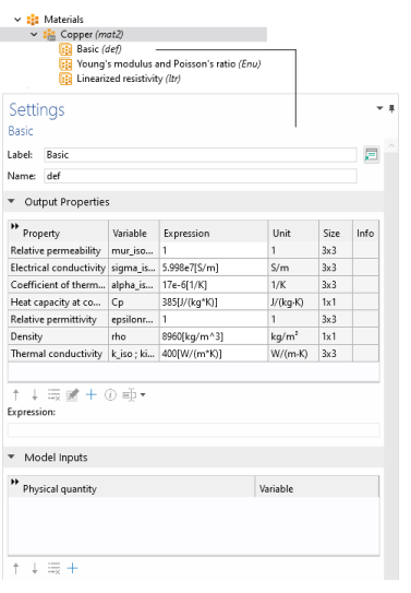 Material property groups are automatically added to the material node in the Model Builder. You can also add additional predefined property groups or create a