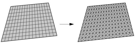 You can create a structured triangular mesh on domains in 2D and on faces in 3D by using the Convert operation. There is an option to either introduce a centerpoint (shown in