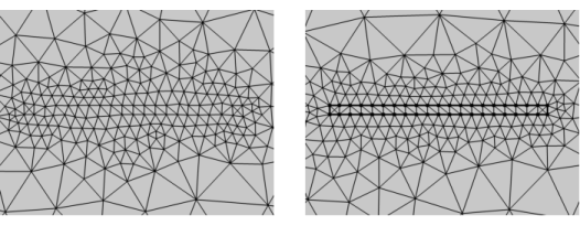 For example, add a rectangle inside a 2D domain to resolve the mesh inside the rectangle (see right image in Figure 8-14). Mark the resulting edges as a mesh control entity to remove it from the geometry when defining the physics and materials. An advantage is that the final mesh need not respect the mesh control edges exactly; it is used only to control element size and then the mesh is smoothed, as shown in the left image below.