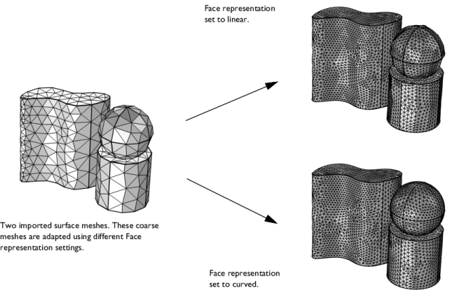 Curved to place new or moved mesh vertices on a curved surface approximation of the input mesh. On curved faces where the mesh has been refined, the resulting mesh will typically be smoother than the input mesh, as seen in the lower right image in Figure 8-31.