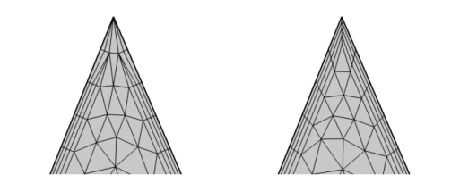 Select Splitting (the default) to introduce boundary layer splits at sharp corners, as shown in Figure 8-33. In the Split for angles greater than field you specify the minimum angle between adjacent boundary layer boundaries for a split to occur. Control the maximum angle of the elements in the split region by the Maximum angle per split parameter.