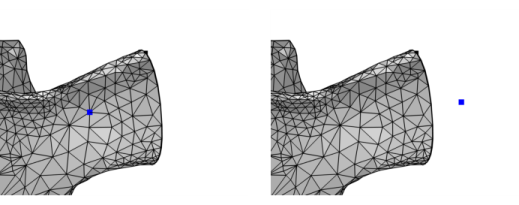 Use the Relative snapping tolerance field to specify a maximum distance within which the specified point will snap to the closest mesh element. If the point is not snapped to a mesh vertex, the element will be partitioned to conform with the added mesh vertex. In other words, if you add a point inside an element, it will be refined to include that point. If you create a vertex inside an unmeshed domain, the vertex will become adjacent to that domain. A vertex element will be created at the snapped point. If there are no such mesh vertices within the tolerance, both a mesh vertex and a vertex element will be created at the specified coordinates. The value in the