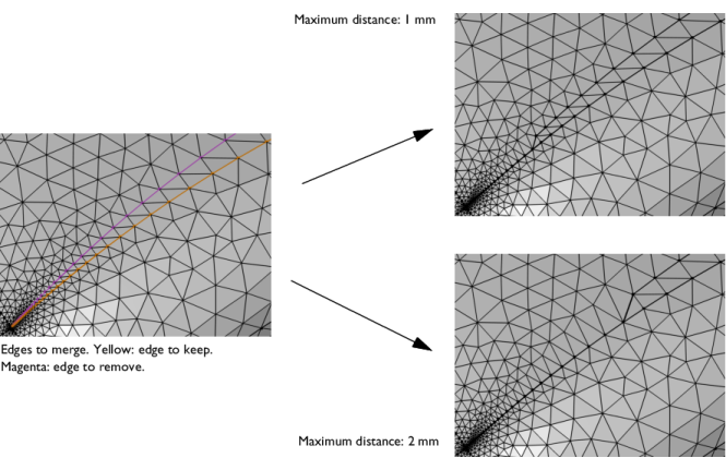Figure 8-89. It is possible to merge boundaries, edges, and points by specifying entities to keep and the entities to remove. Depending on the specified maximum distance, only parts of the entities are merged, similar to the geometry operation