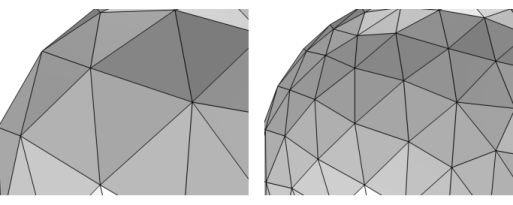 Curved to place new or moved mesh vertices on a curved surface approximation of the input mesh. On curved faces where the mesh has been refined, the resulting mesh will typically be smoother than the input mesh, as seen in the lower right image in Figure 8-99.