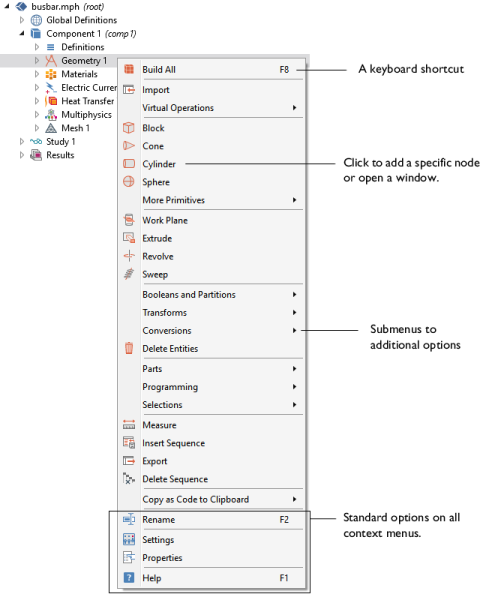 The layout of the context menu (especially for physics interfaces) depends on whether the nodes are grouped by space dimension. The default is ungrouped nodes. See Grouping Nodes by Space Dimension and Type for an example comparing the different context menus.