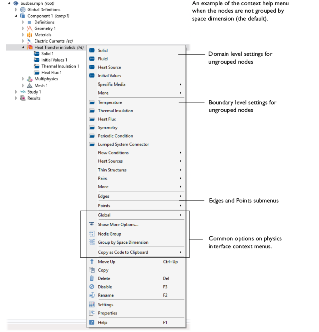 The context menu opens when you right-click a physics interface node, or any node in the Model Builder (see Opening Context Menus and Adding Nodes). Depending on the space dimension, this menu is divided into these sections for most physics interfaces: the first section contains domain settings, the second boundary settings, the third edge settings, and the fourth has point settings.